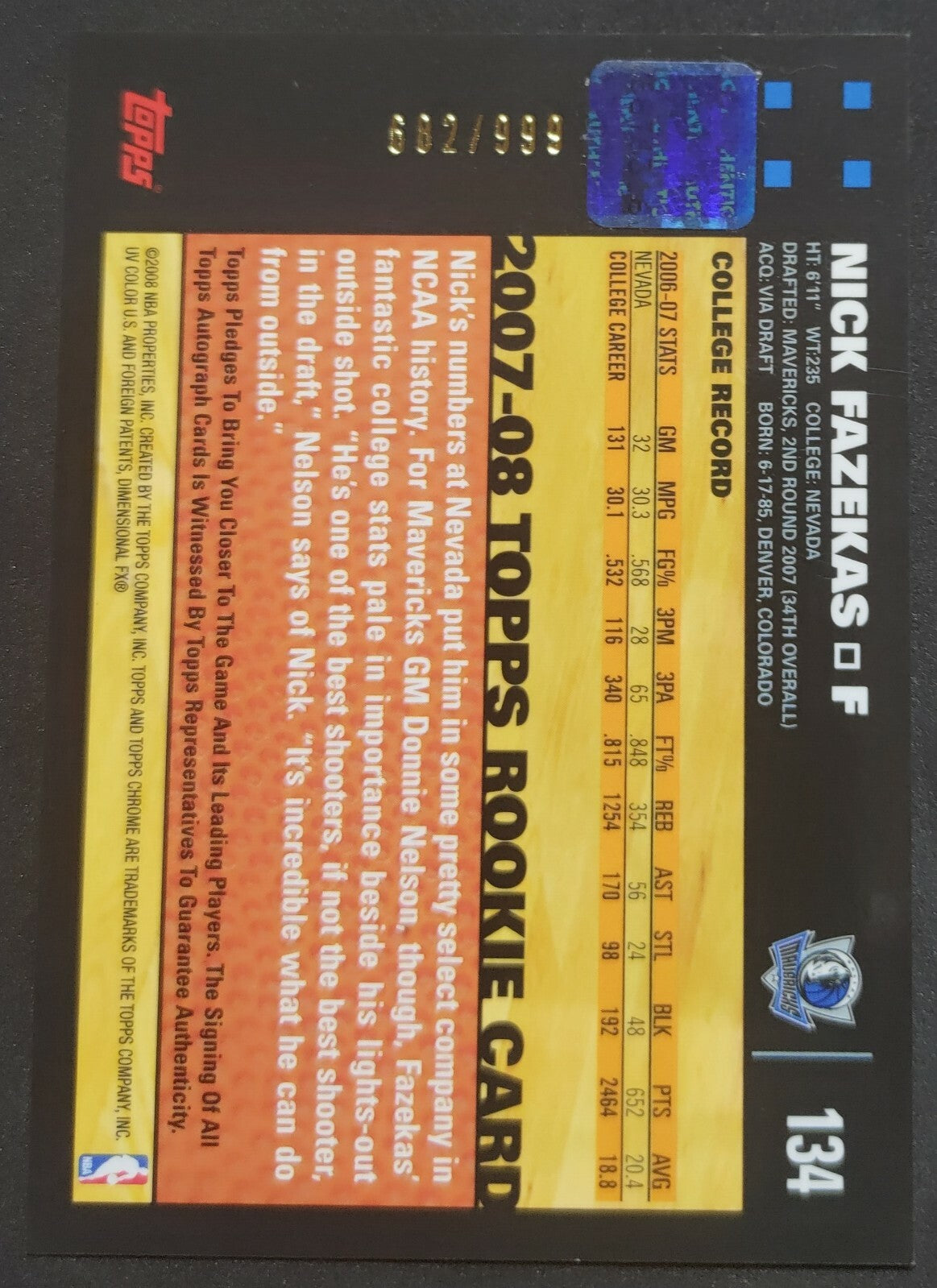 NBA - 2007-08 Topps Chrome Rookie Autograph Nick Fazekas 682/999 Card. Card is in NM condition, however, please use photos...