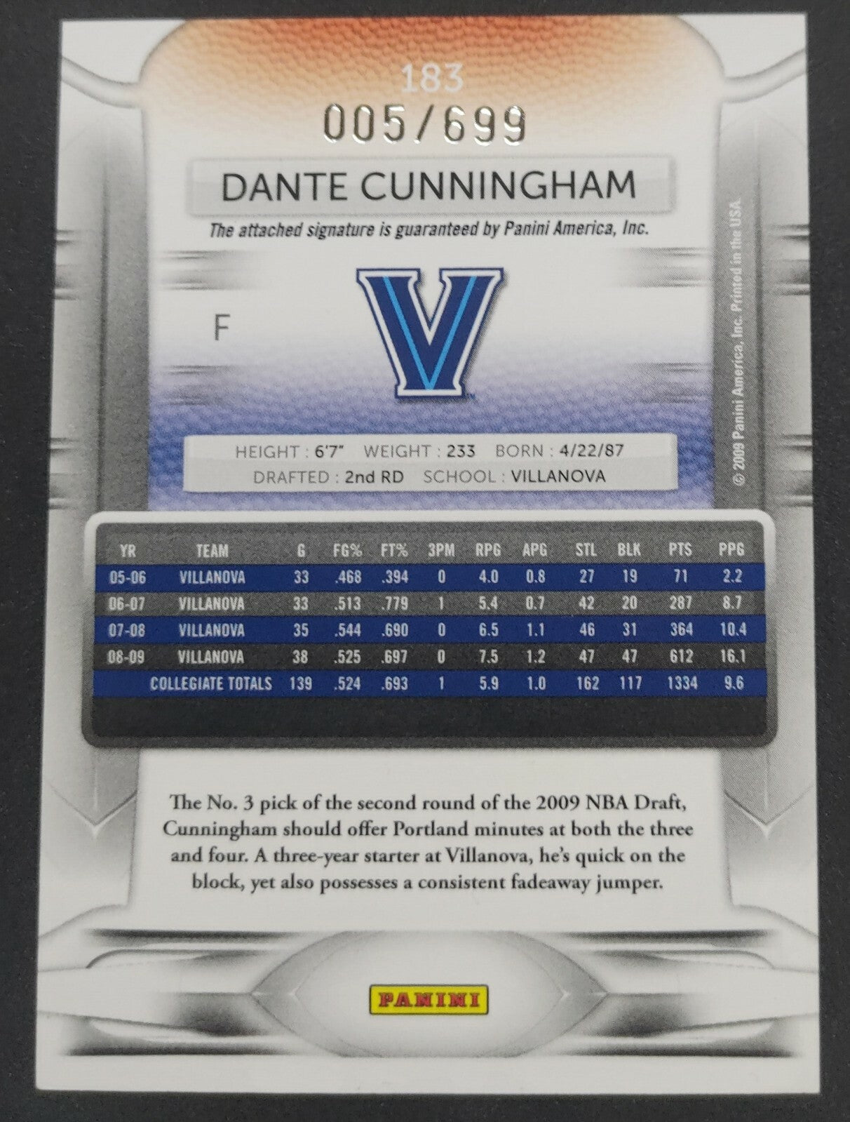 NBA - 2009-10 Panini Dante Cunningham 005/699 Autographed Card. Card is in NM condition, however, please use photos to assess...