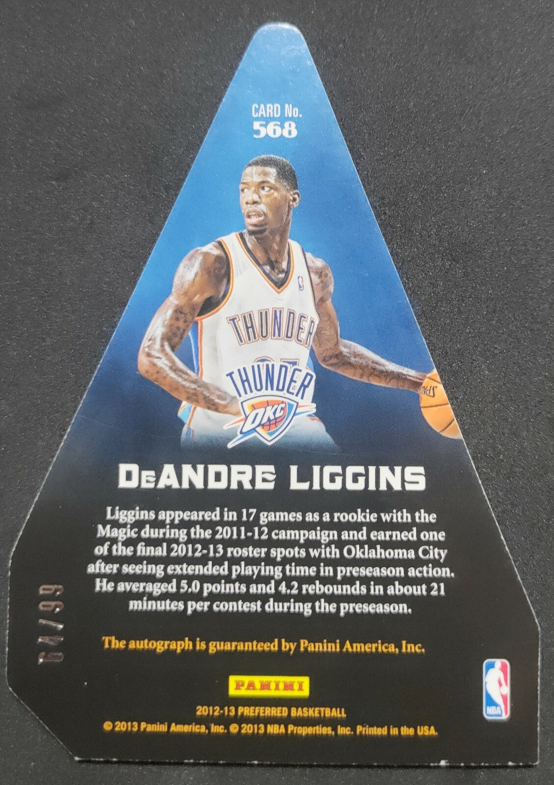 NBA - 2012-13 Panini's Choice Award - DeAndre Liggins 64/99 Autographed Card. Card is in EXC condition, however, please use...