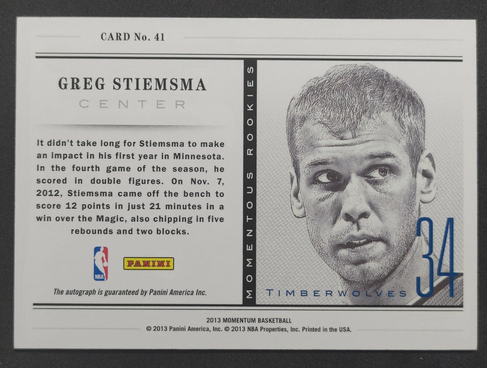 NBA - 2013 Panini Momentous Rookies - Greg Stiemsma Autographed Card. Card is in NM condition, however, please use photos...
