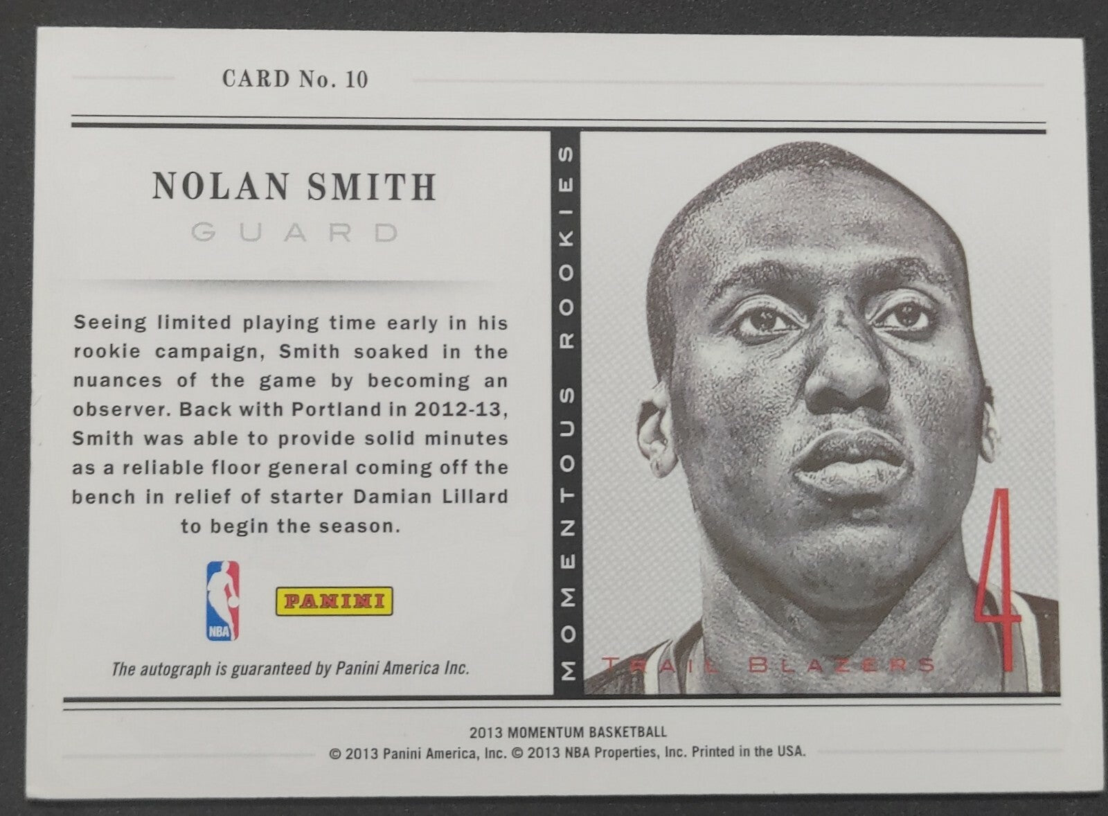 NBA - 2013 Panini Momentous Rookies - Nolan Smith Autographed Card. Card is in NM condition, however, please use photos...
