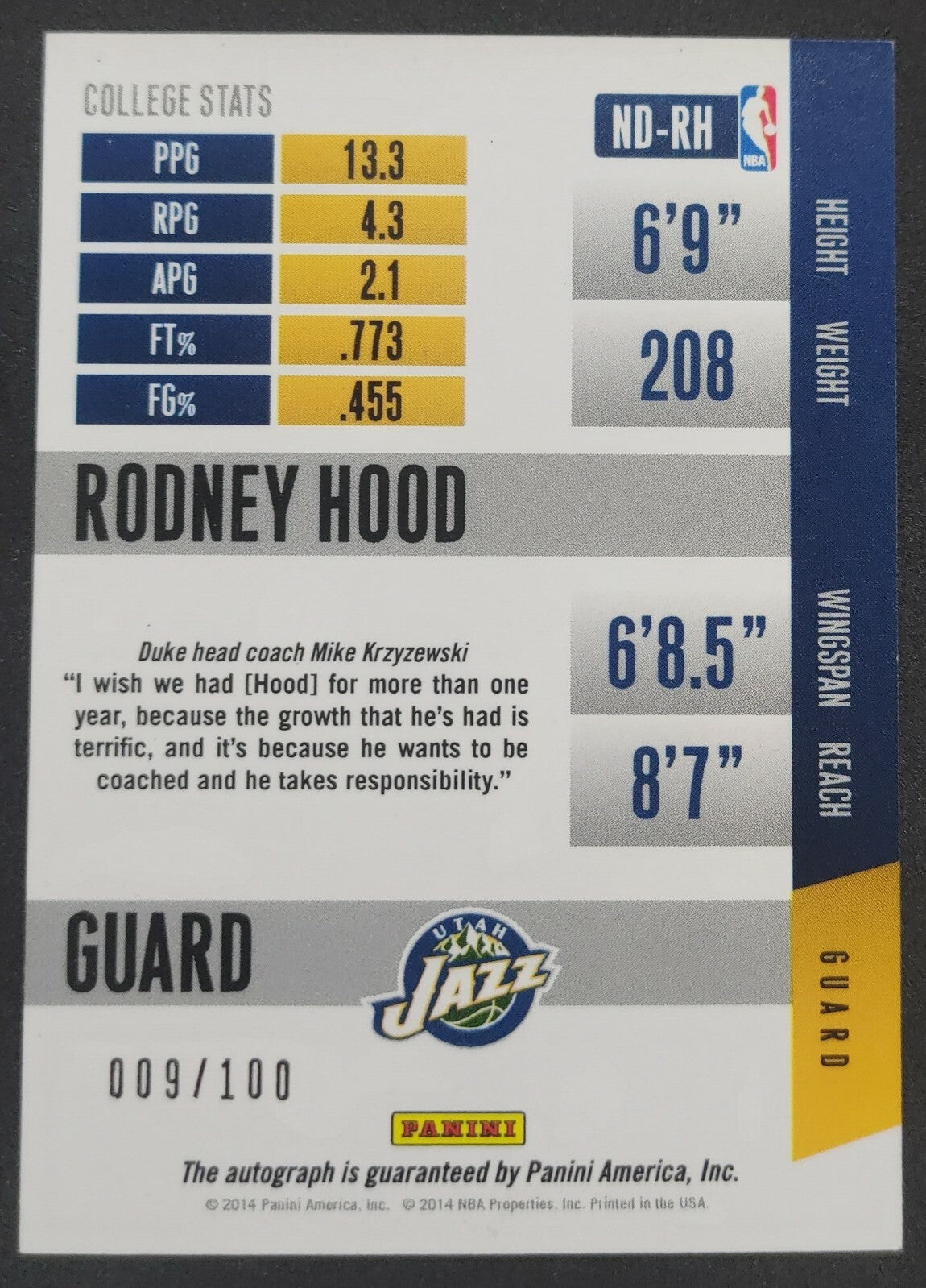 NBA - 2014-15 Panini Rodney Hood 009/100 Autographed Card. Card is in NM condition, however, please use photos to assess...