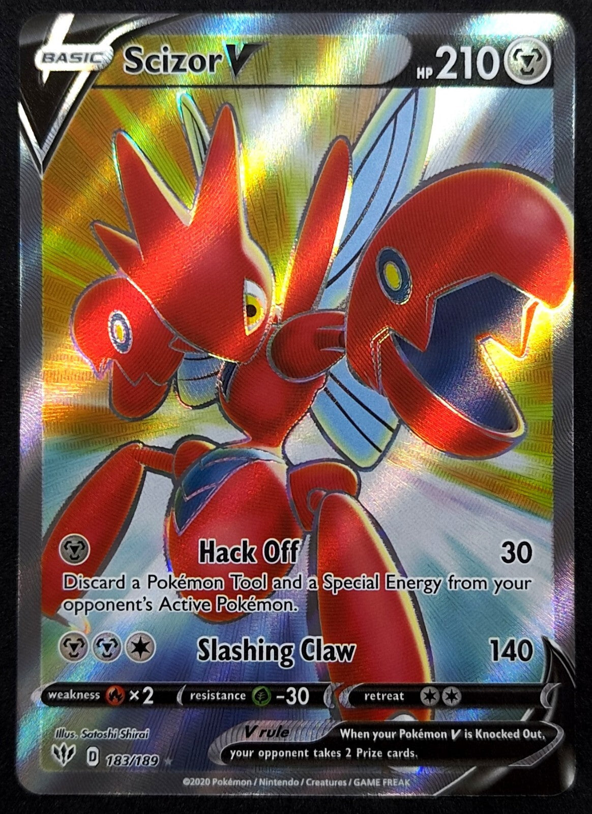 Get your hands on this stunning Scizor V card from the Darkness Ablaze set of the Pokémon TCG. This full...